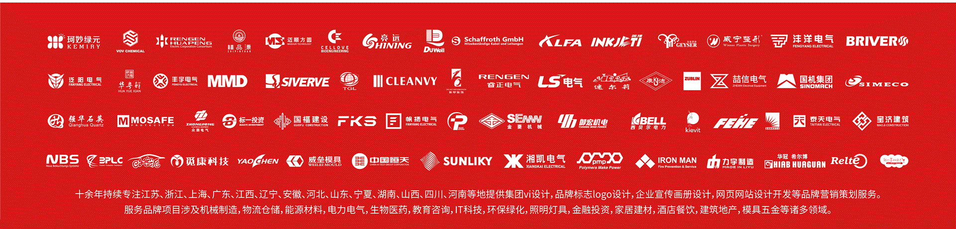 機(jī)械制造,物流倉儲(chǔ),新能源新材料,電力電氣,生物醫(yī)藥,工業(yè)設(shè)備,教育咨詢,IT科技,環(huán)保綠化,照明燈具,金融投資,家居建材,酒店餐飲,房地產(chǎn),汽車,模具五金,工程建筑,水處理,大氣污染治理等行業(yè)集團(tuán)公司提供集團(tuán)vi設(shè)計(jì),logo設(shè)計(jì),商標(biāo)標(biāo)志設(shè)計(jì),企業(yè)樣本,宣傳宣傳冊(cè)設(shè)計(jì)印刷,包裝設(shè)計(jì),品牌營銷策劃,企業(yè)網(wǎng)站開發(fā)服務(wù)。