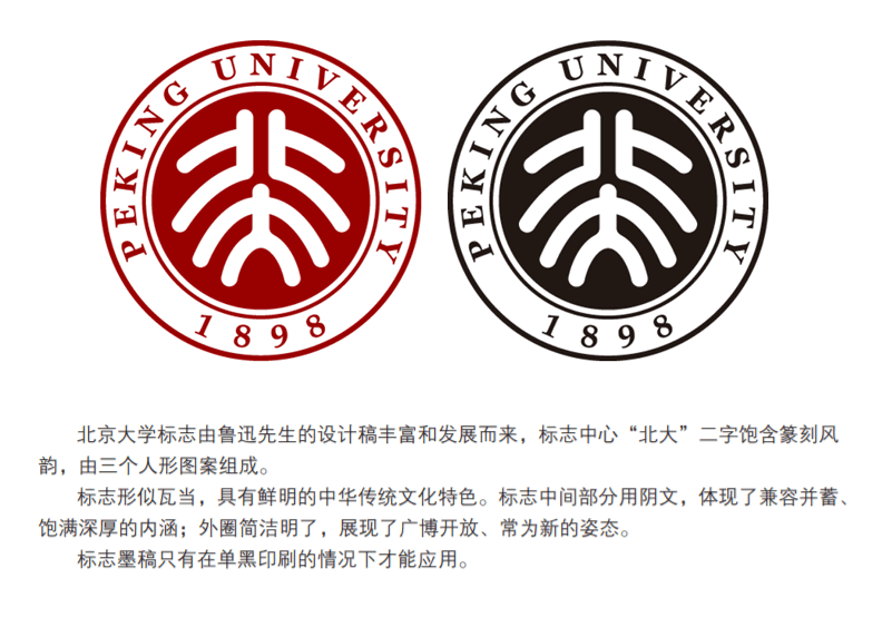 北京大學標志由魯迅先生的設計稿豐富和發展而來,標志中心“北大”二字飽含篆刻風韻,由三個人形圖案組成。標志形似瓦當,具有鮮明的中華傳統文化特色。標志中間部分用陰文,體現了兼容并蓄、飽滿深厚的內涵;外圈簡潔明了,展現了廣博開放、常為新的姿態。